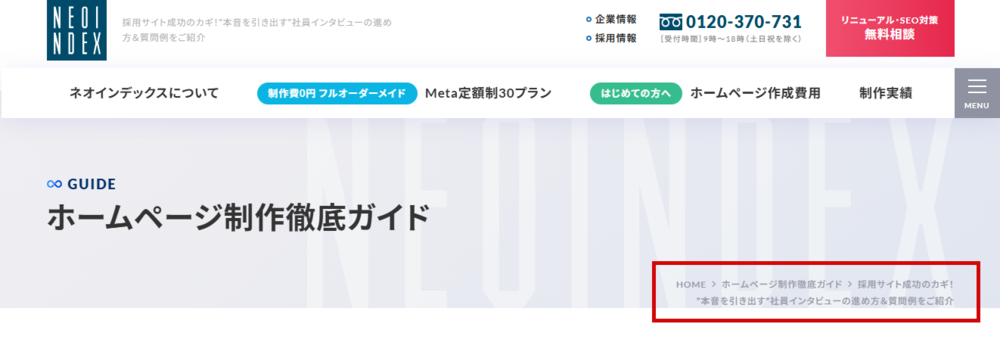 併せてここで大事なのが「パンくずリスト」の存在です。今、サイトのどこにいるのかを明示することで、ユーザーもGoogleも迷子にならずに済みます。