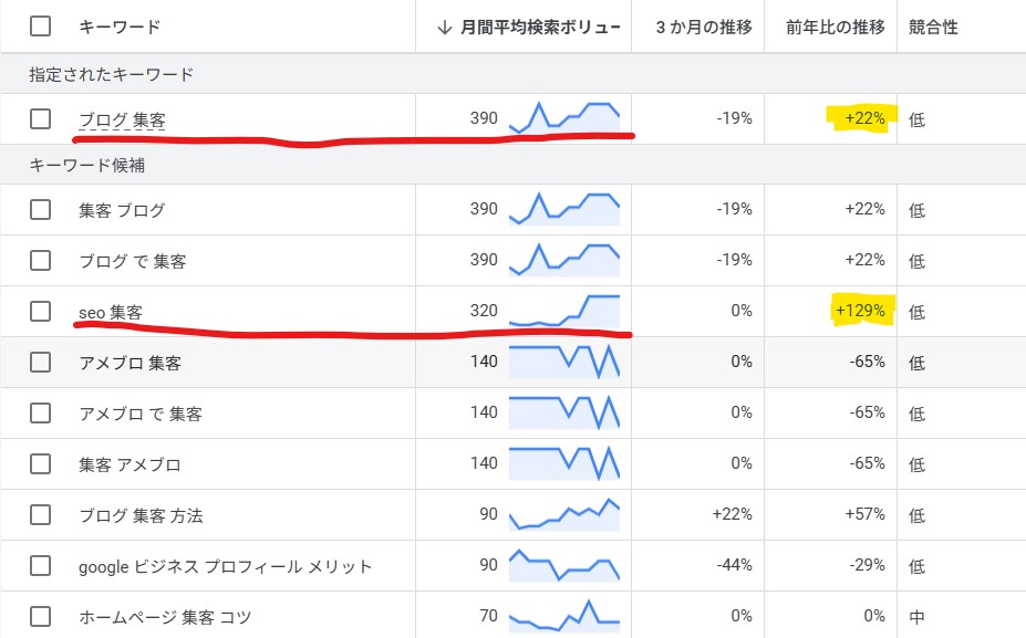 また、「SEO集客」というキーワードも注目です。検索数は、月間320回と「ブログ集客」より少ないですが、昨年からの伸び率は圧倒的に多いです。もしかすると、来年には「SEO集客」の方がニーズが高くなるかもしれません。