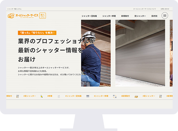 今回新規作成の主要な目的として、「潜在顧客との接点を拡大したい」というご要望をいただきました。そのため、情報収集段階のユーザーが自分の悩みに合ったコラムへスムーズにたどり着けるよう、「シャッター職人コラム」をキーワード検索できる機能をトップページに実装しました。 デザイン面では、「シャッターでお悩みの方に、ホームページを通じて安心して知識を深めていただきたい」というお客様の想いを表現するため、「新着記事」や「人気記事」などの背景に、柔らかく温もりを感じさせるノイズ調のデザインを取り入れました。 また、メインビジュアルをはじめ、ページ全体にはシャッター修理に真剣に向き合う男性のお写真や、実際に取り扱ってきた多様な種類のシャッターのお写真を配置しています。そうすることで、企業としての誠実さや専門性を視覚的に伝え、掲載されている情報への信頼感を高める工夫を施しました。 |