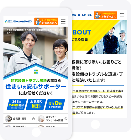 「電気工事の依頼を考えている方」「給湯器の交換を検討している方」などの個人ユーザーをメインターゲットとしているため、スマートフォンとPCの使用比率を8:2に想定し、モバイルファーストで設計しております。 デザイン面では、親しみやすさを感じられるよう、家や窓をモチーフにしたシェイプやポップなイラストを数多く取り入れました。ページ各所には笑顔で作業する人物写真を多く採用することで、ユーザーに信頼感と安心感を視覚的に印象づけています。 また、色使いにもこだわり、電気をイメージさせるイエローと、水回りを想起させるブルーを組み合わせることで、事業の特徴をデザインに落とし込みました。さらに、どちらも色調のはっきりとした鮮やかなカラーを採用することで、住宅設備に関するお悩みを解決した後の明るくポジティブな印象をユーザーに与えられるように仕上げました。色の持つ心理的効果も取り入れることで、ユーザーからのお問い合わせを生み出す「成果につながるホームページ」を作り上げています。 |