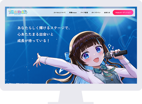 今回、新規作成の主要な目的として、「オーディションの応募を強化したい」というご要望をいただきました。そのため、画面の大きなPCサイトの特長を活かして、メインビジュアルにオーディションのイメージキャラクターを大きく配置しています。輝くステージの上で、堂々と笑顔で歌う姿が描かれたイラストには、「あなたらしく輝けるステージで、心あたたまる出会いと成長が待っている!」というキャッチコピーの想いを、より力強く視覚的に伝える効果がございます。 デザイン面では、ユーザーがワクワクするような工夫を随所に取り入れています。たとえば、「Vtuberオーディション」ページに掲載している「オーディションに合格したら」や「デビューまでの流れ」というコンテンツには、それぞれの内容が視覚的にイメージできる可愛らしいSDイラストを配置しました。オーディションのイメージキャラクターを活用することで、デビューへのワクワク感やVtuberという職業への親近感を演出する、お客様ならではのオリジナリティあふれるデザインとなっています。 |