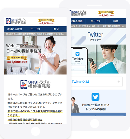 Webに関する専門家と探偵としての調査技術を融合させた総合探偵事務所である、SNSトラブル探偵事務所様のサービスサイトをリニューアルさせていただきました。 |
